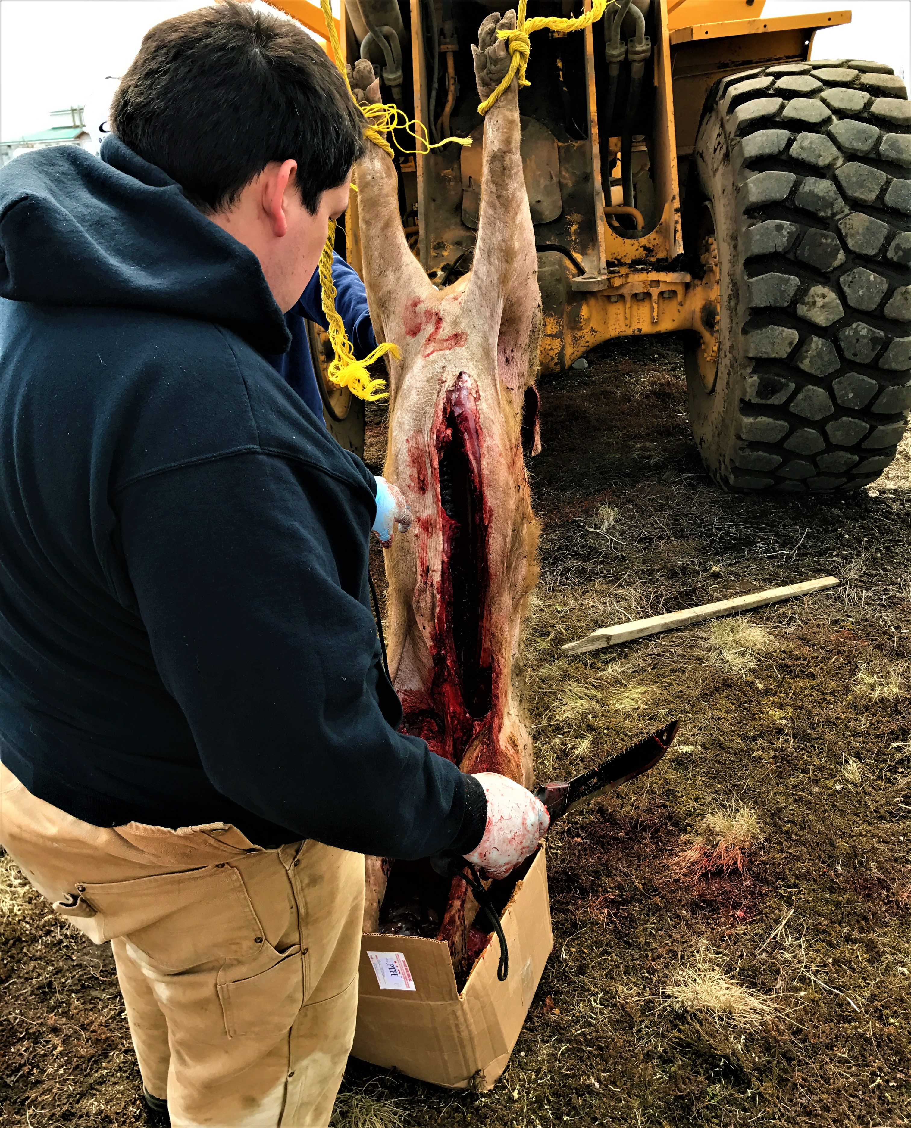 First, the few minutes right after dispatch are clutch cargo moments, cause it’s mission critical that you flip that pig to bleed it out lickity-split. Once inverted, with the head below the heart, cut a major artery – the carotid seems to work best – and let that blood run. (If this is happening inside, you may want to re-think your strategy, or at least throw down some plastic sheeting).
